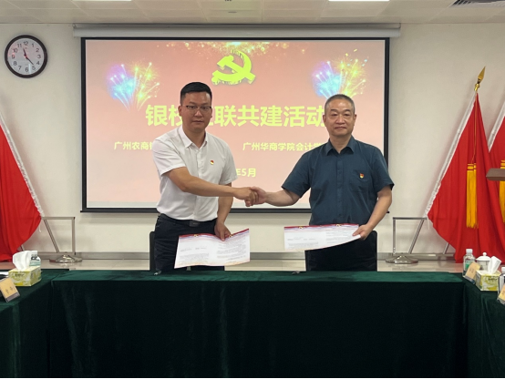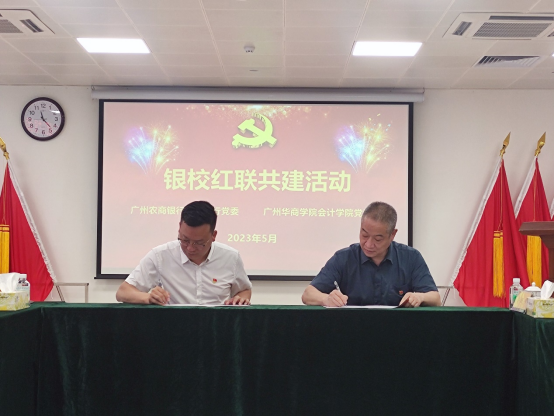 2023年5月26日,会计学院党委和广州农商银行增城支行(简称“农商行增城支行”)党委在合汇广场增城农商行总部进行红联共建主题活动及签约仪式。本次活动是根据学习贯彻习近平新时代中国特色社会主义思想主题教育的要求,结合共建双方实际,实现资源共享、优势互补、互助共建,促进党建与业务发展“同频共振”,开展“校银携手,合作共赢”为主题的红联共建工作。广州农商银行增城支行党委副书记兼纪委书记赵明、党委委员兼行长助理谢超颖、党委委员兼零售业务部经理田春雷,广州太阳成集团tyc122cc入口会计学院党委副书记陈洋广、党委委员兼副院长周书域、学工办副主任兼党支部书记杨烨瀚等一行出席活动。农商行增城支行部门经理、员工党员代表,会计学院部分党支部书记、20名学生党员代表共同参加本次活动。
